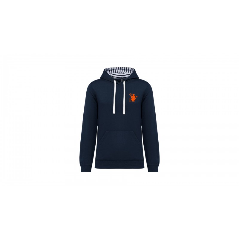 80% coton / 20% polyester. Molleton gratté. Manches montées. Capuche doublée. Poches Kangourou. Finition bord-côte bas de manches et de vêtement.