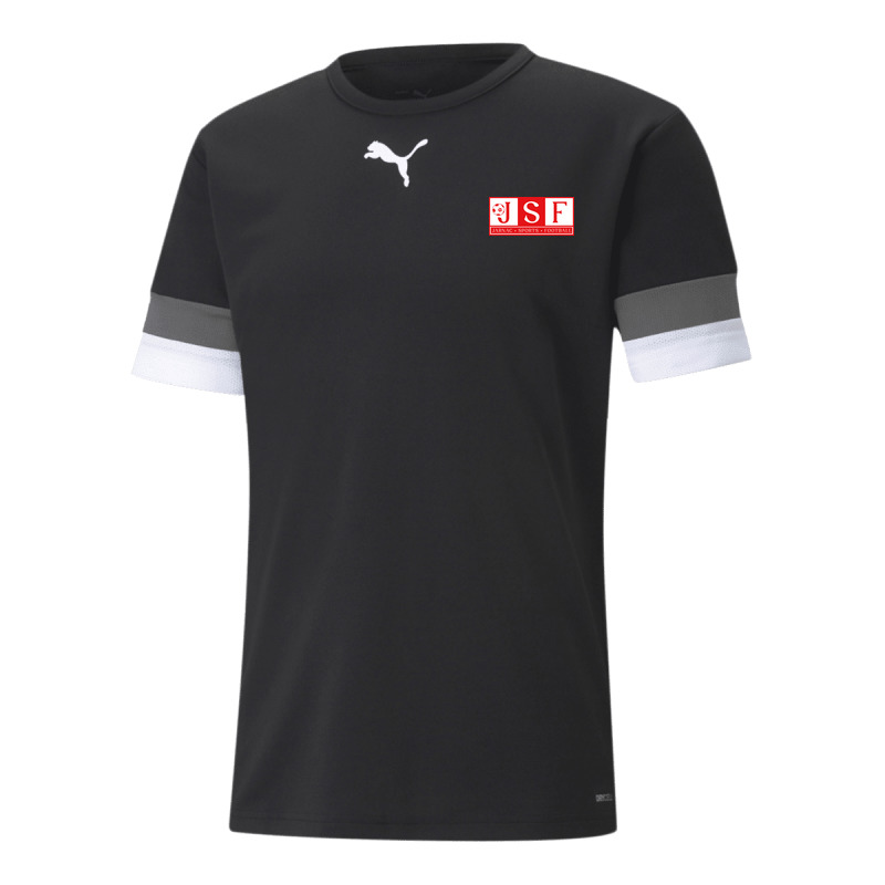 Maillot de foot 100% polyester. Col rond avec coupe classique. Bandes ajourées noires et blanches en bout de manches.